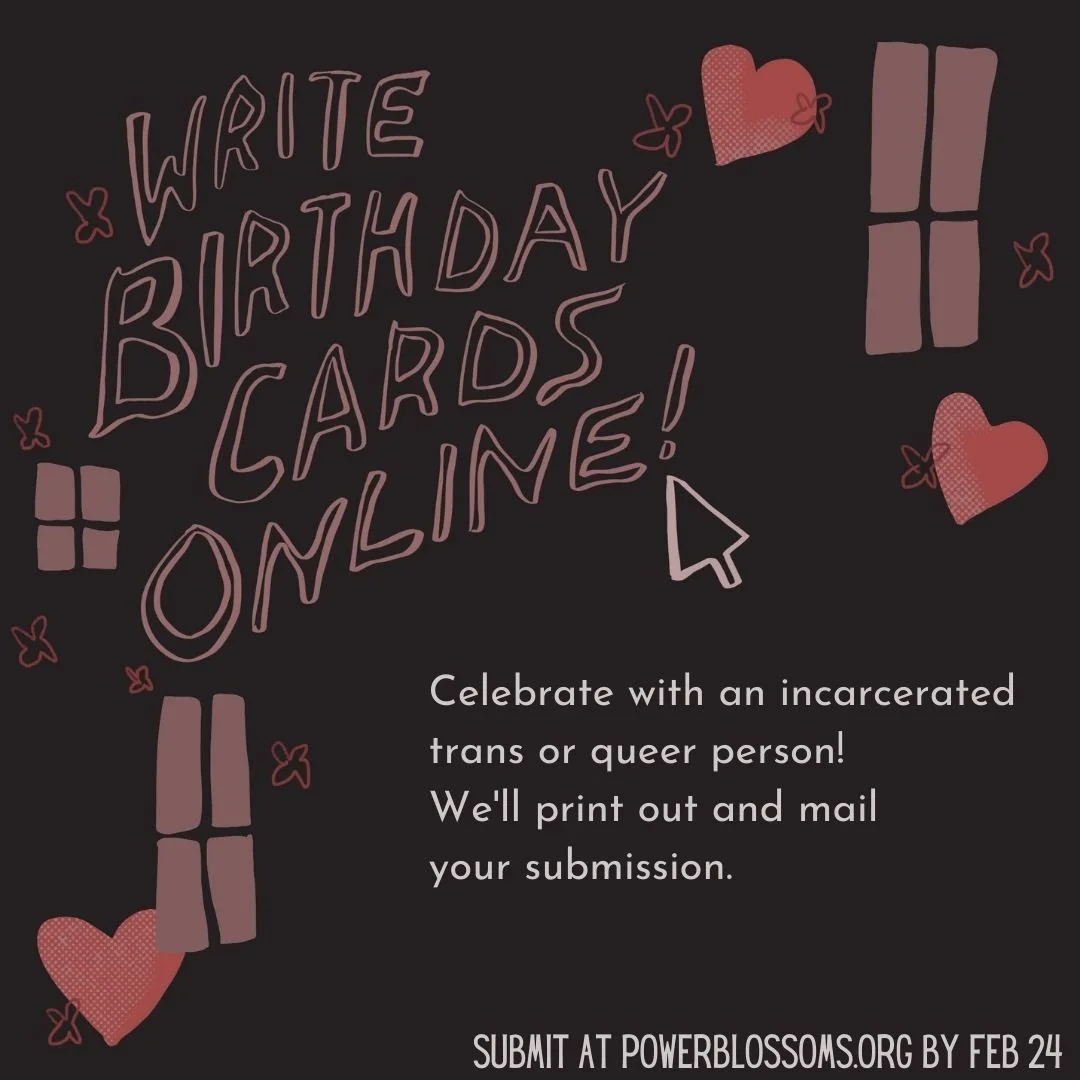 If you feel compelled to do more after writing, get involved in Power Blossoms or donate to help cover the cost of this and other programs we run. If you’d like to take on the commitment of writing to someone inside on a regular basis, consider becoming a penpal!